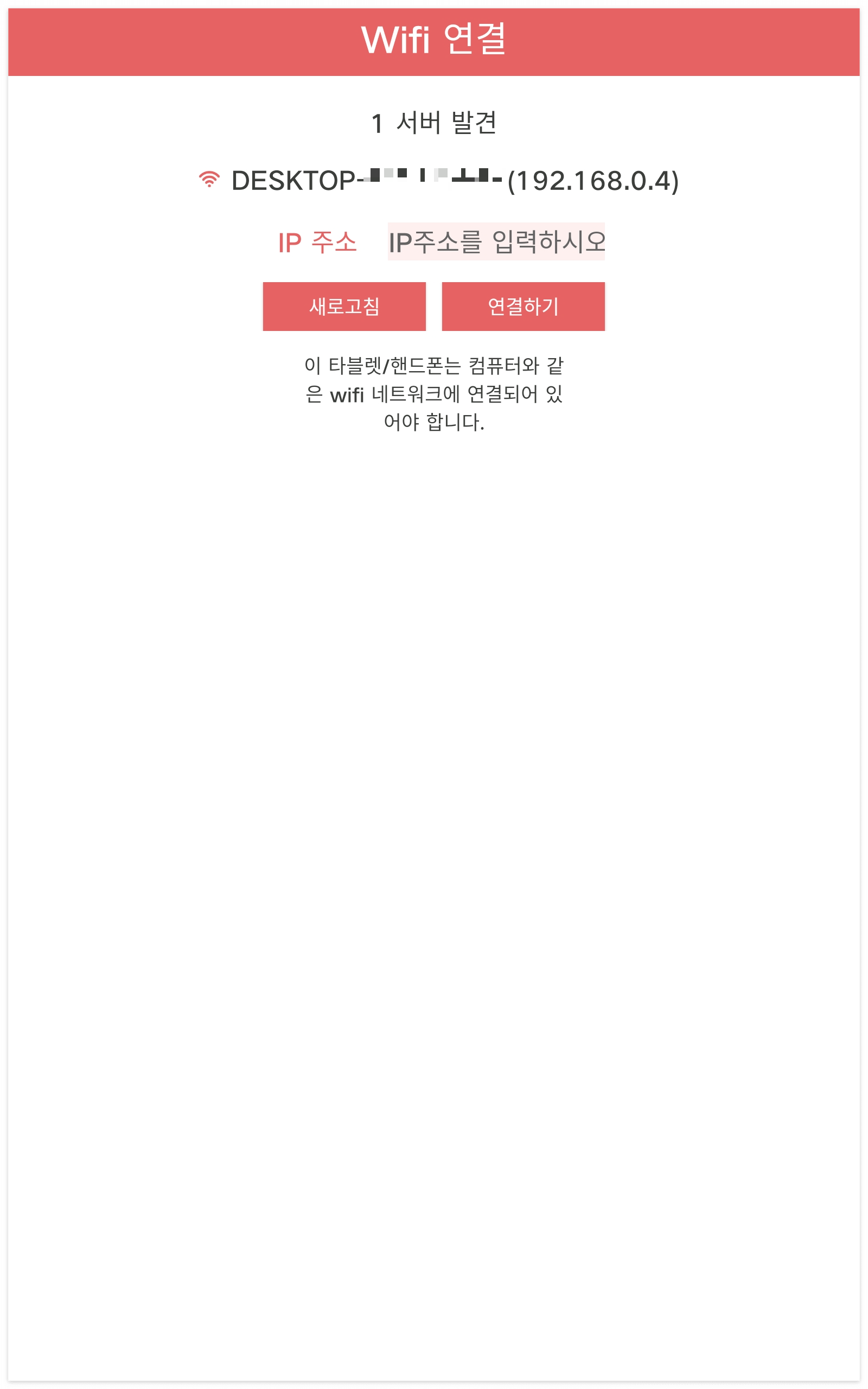 태블릿에서 설치 후 실행 하게 되면 USB,블루투스,WIFI 로 연결이 가능하다. 편한 연결 방식을 선택하면 된다 나는 WIFI를 이용하여 공유기에서 물려있는 데스트탑PC의 서버프로그램을 찾아서 연결 하기로 했다.