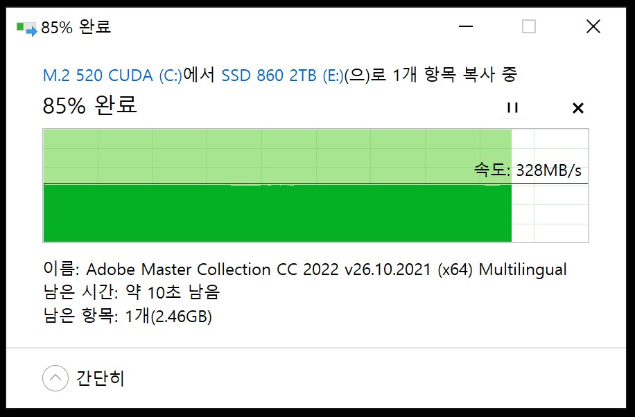 외장하드 삼성 860 EVO SSD (쓰기 속도 : 520MB/s ) 제품으로 테스트했습니다.