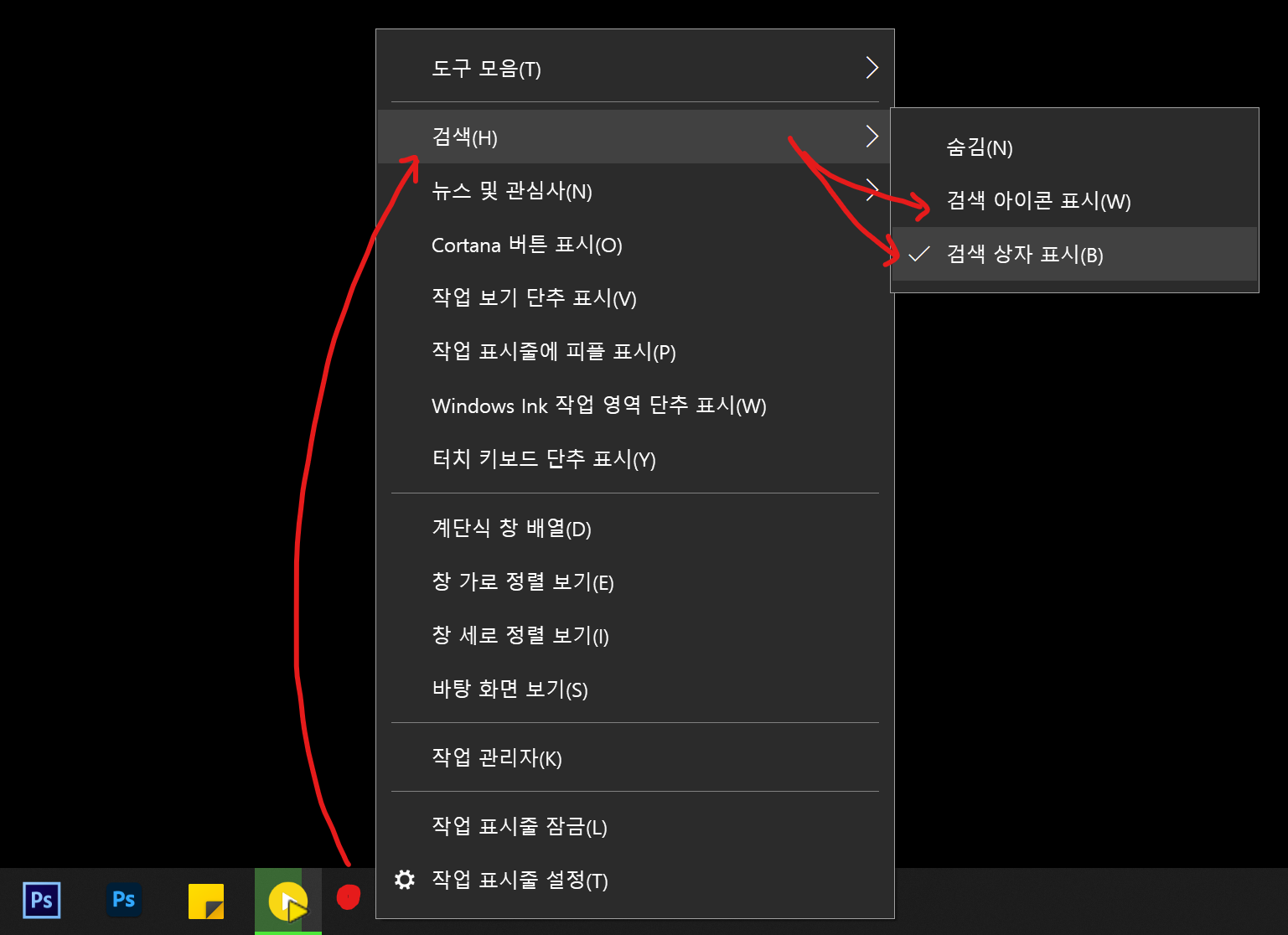 윈도우 아래 아이콘이 있는 메뉴창에서 < 마우스 우측 → 검색 → 검색 상자 표시 > 가로바 형식으로 표시