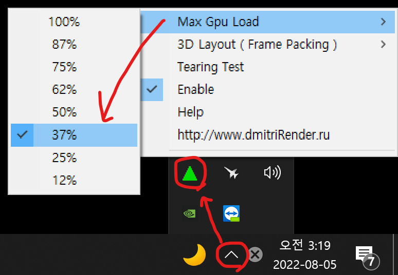 윈도우 아이콘 창 ^ 클릭 > ▲ 마우스 우측 > Max Gpu Load > 퍼센트 조절