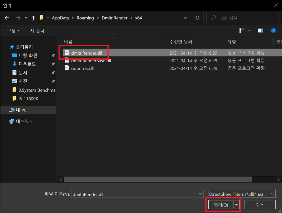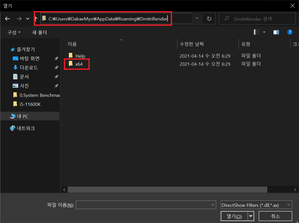 경로로 이동 후, 사용하는 동영상 플레이어 비트 버전에 맞는 버전의 폴더로 이동을 한다. 필자는 64비트 동영상 플레이어를 사용 중이라 x64 폴더로 이동했다. 자신에게 맞는 비트의 폴더로 이동 후 dmitriRender.dll 파일을 선택하여 열어준다.