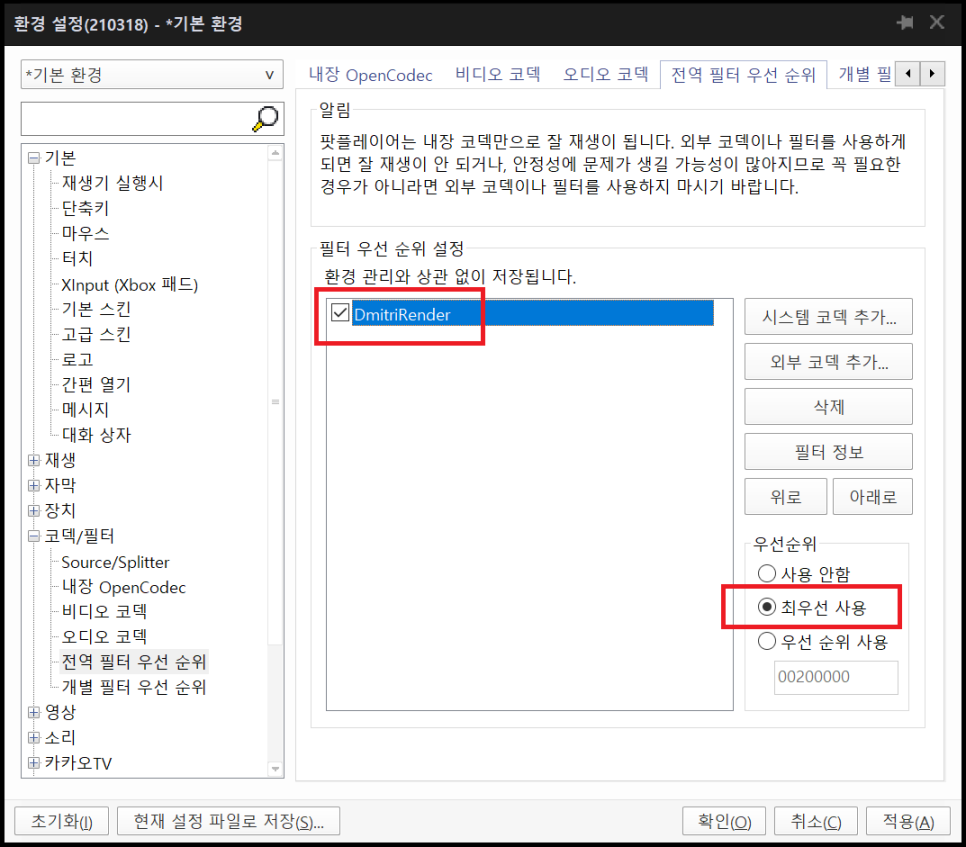 이제 동영상 플레이어를 실행시킨 후 환경설정에서 코덱/필터 카테고리에 '전역 필터 우선순위' 항목을 클릭 후 '외부 코덱 추가' 버튼을 눌러