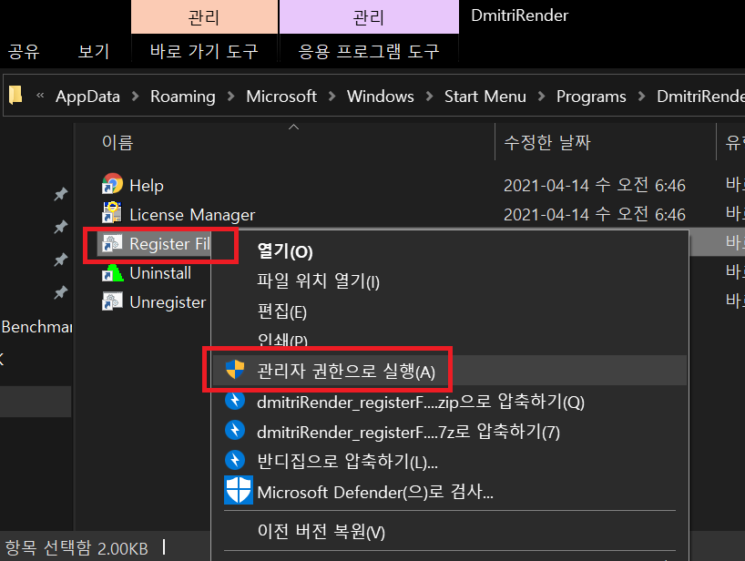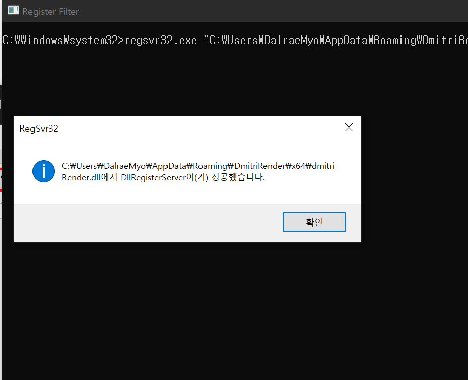 시작 메뉴를 다시 눌러 'Register Filter'를 검색 후 검색된 항목을 우 클릭하여 '파일 위치 열기'를 한 뒤, 'Register Filter' 바로 가기 파일을 우 클릭하여 '관리자 권한으로 실행'을 눌러준다. 그럼 명령 프롬프트 창이 하나 뜨고 설치가 완료되었다는 메시지가 출력되는데 확인을 눌러 닫아주면 된다.