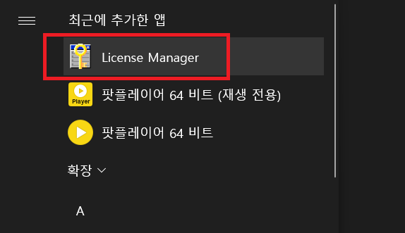 시작 메뉴를 눌러 라이선스 매니저에서 제품의 활성화 키를 입력이 가능하다.