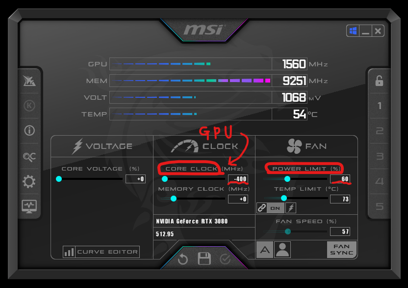 POWER LIMIT : 그래픽카드에 전력을 넣는 량을 조절할 수 있다 50~60%까지 조절하면 적절하다, 너무 적게 설정하면 전력 부족으로 그래픽카드에 영향을 줄 수 있다.